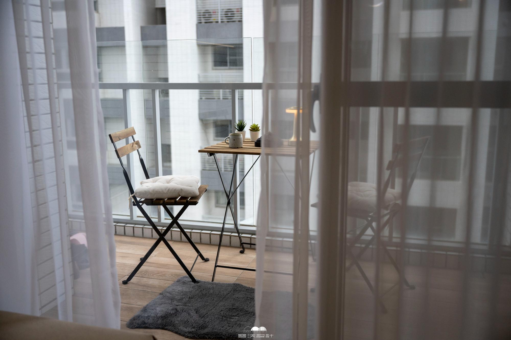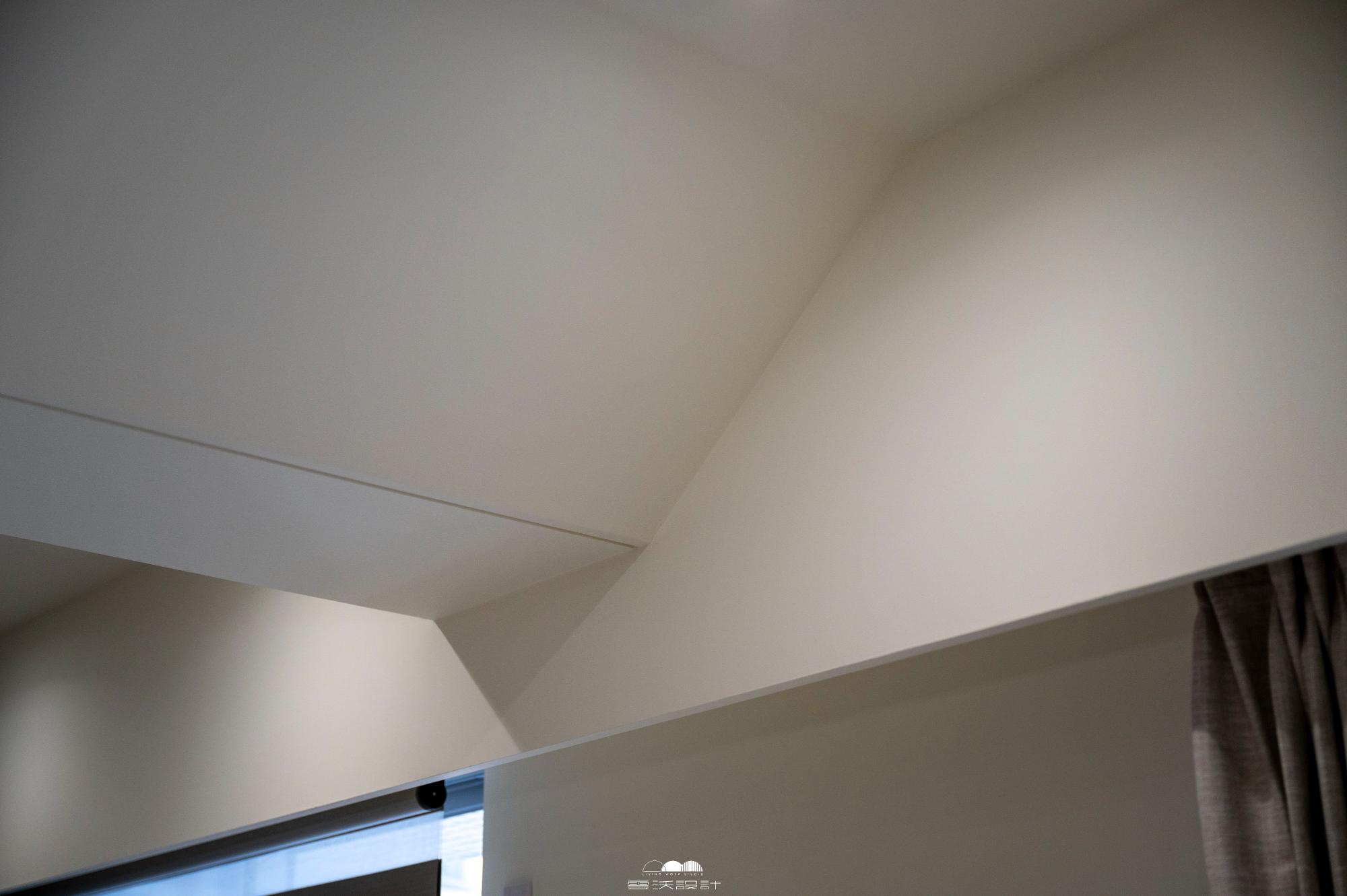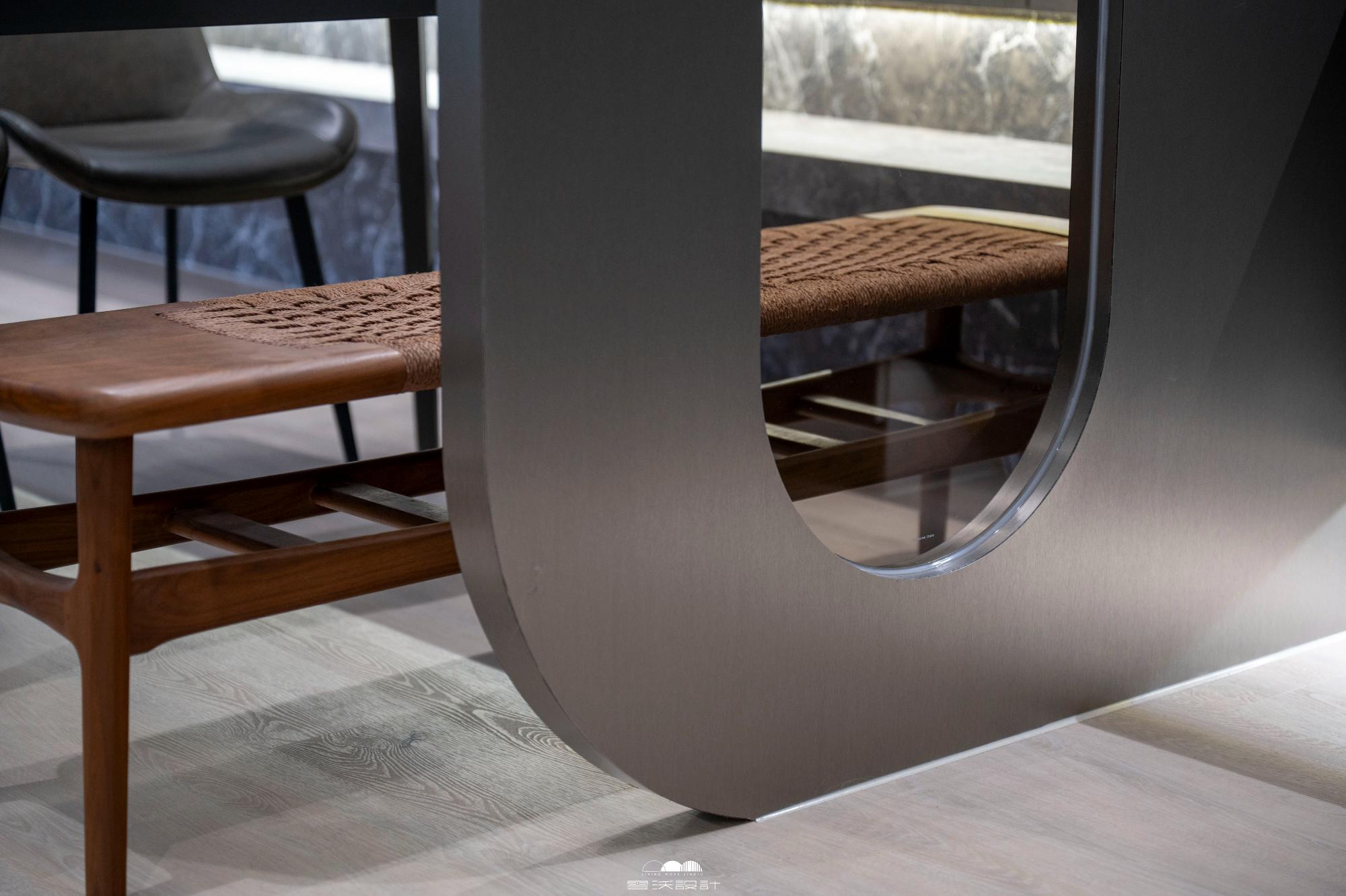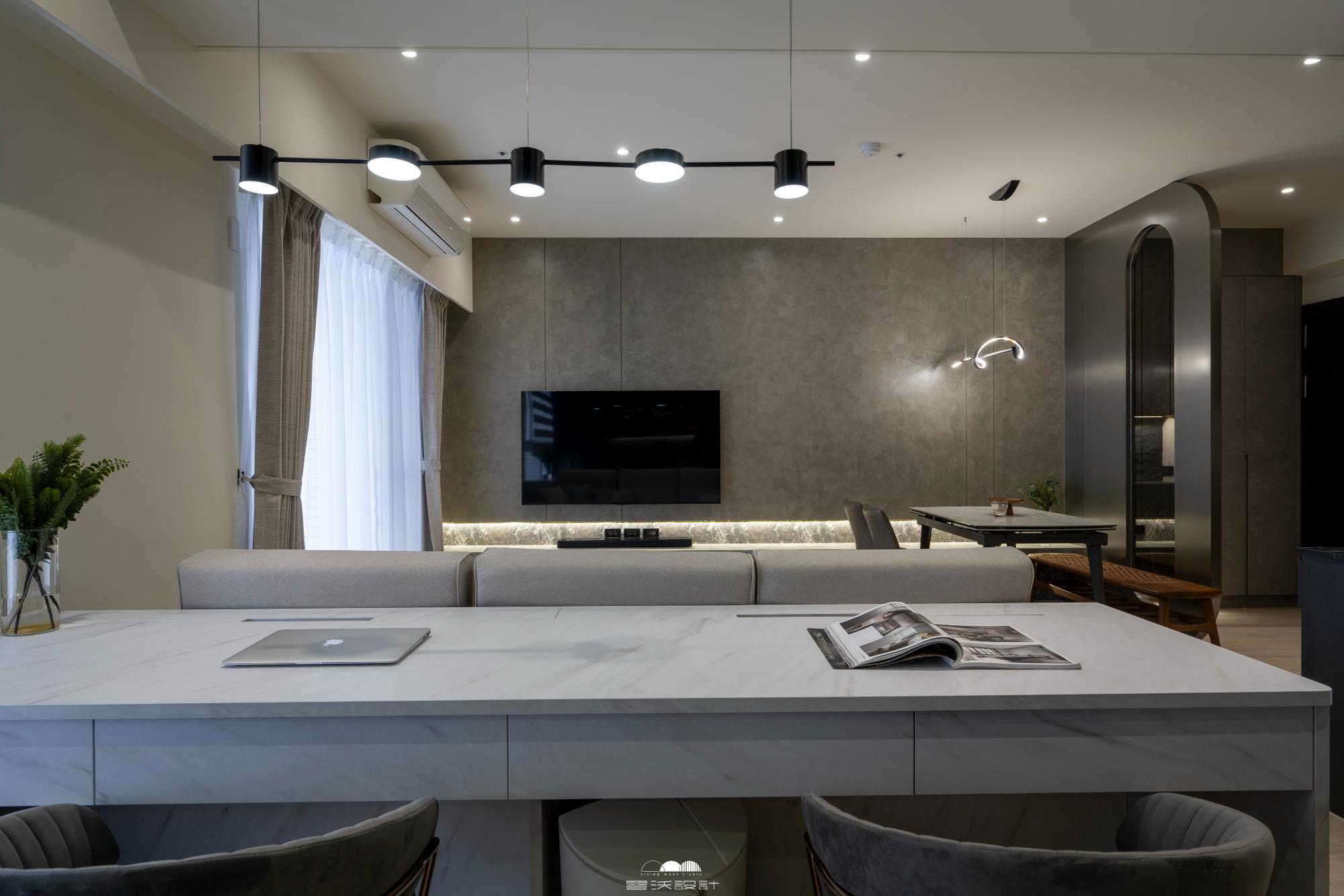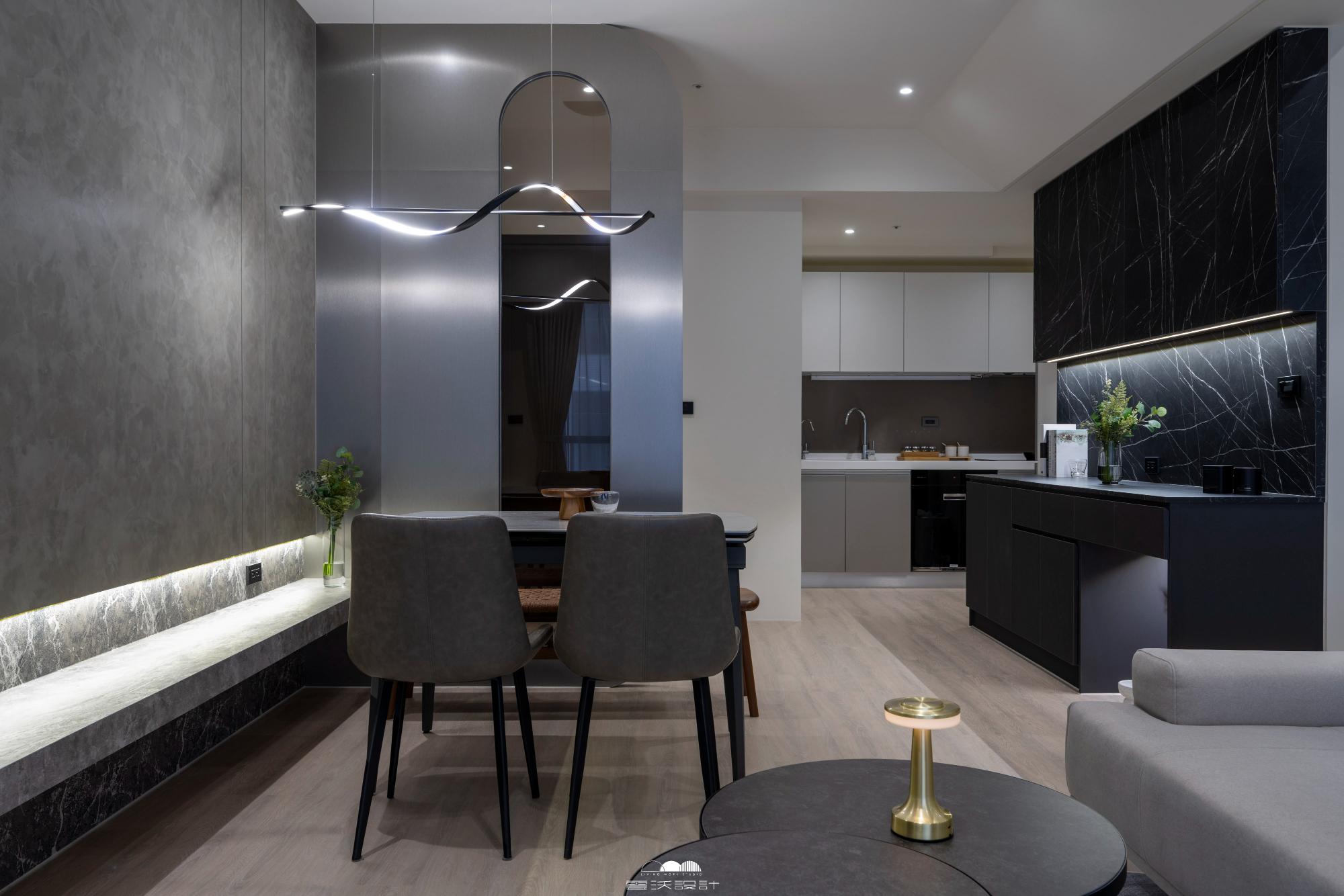 照明以溫暖色調的燈具為主,同時在空間中巧妙運用圓弧形狀的燈飾,呼應整體設計的圓弧鐵件。窗簾方面選擇深色系,加入質感豐富的軟飾如絨布或羊毛,讓整個空間散發著沉穩而現代的氛圍。