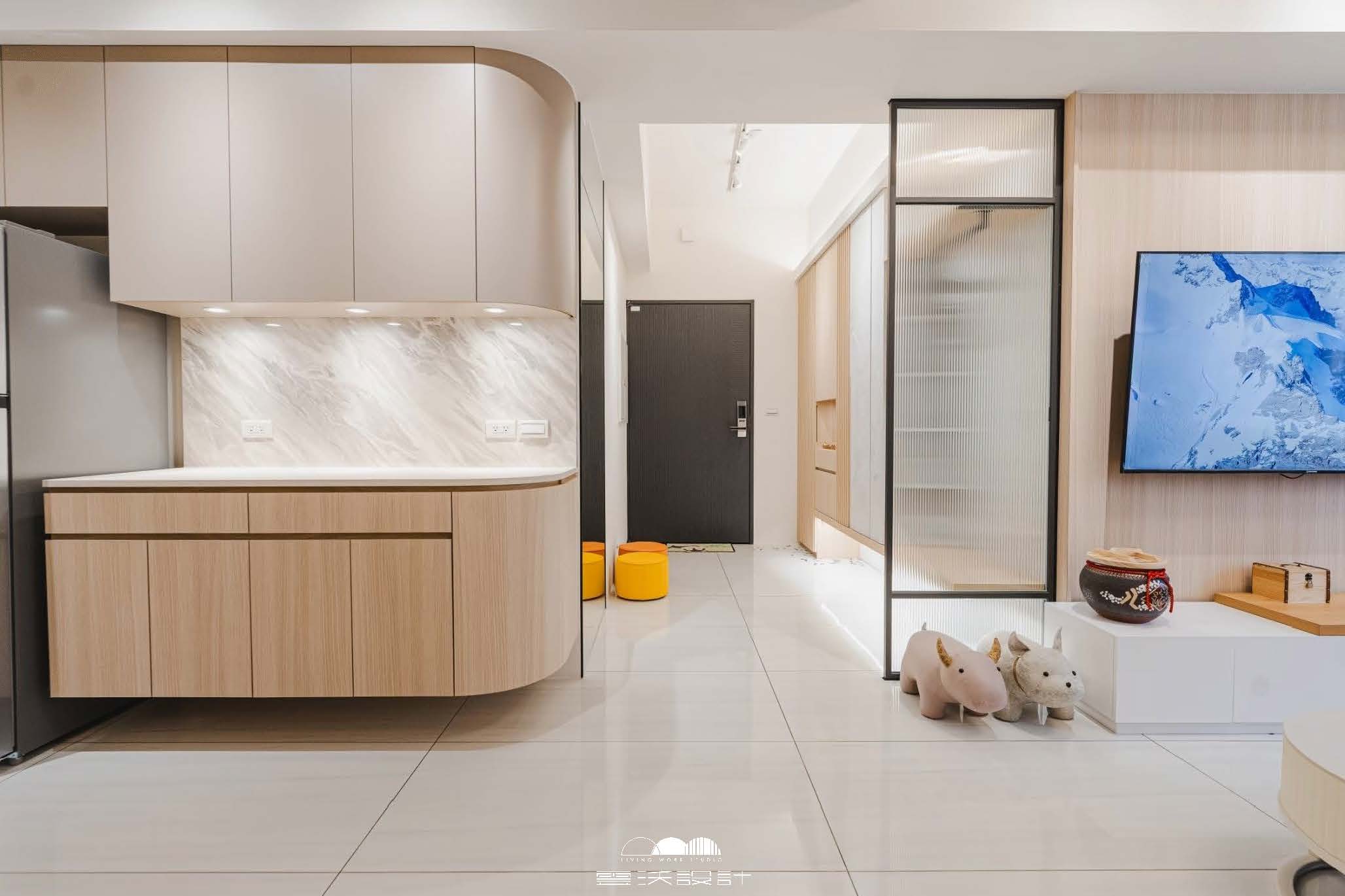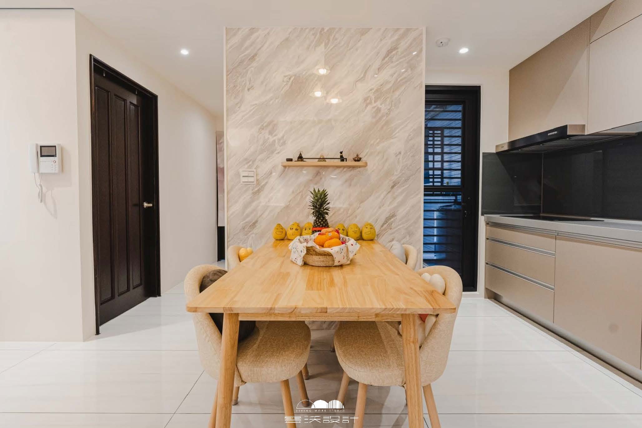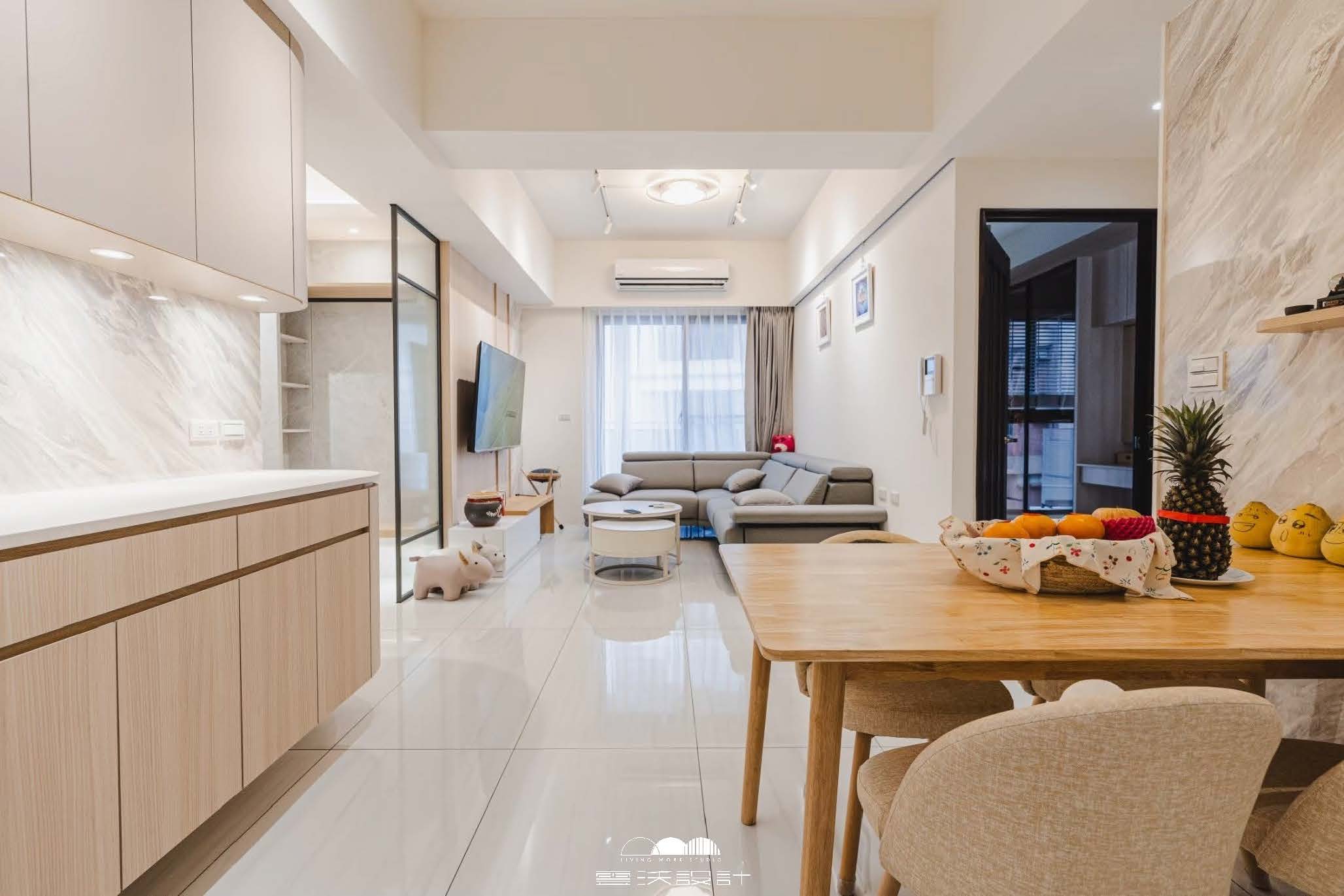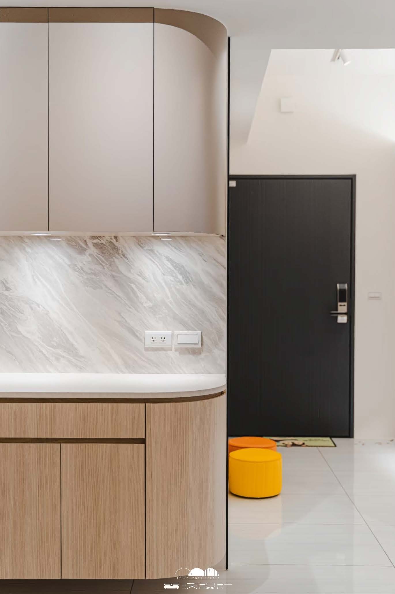 在這富有層次感的居住空間中,白色石材和溫潤的木紋彷彿在互相對話,創造出一種極具藝術氛圍的美感。白色石材散發著冷靜而高雅的氛圍,為空間帶來獨特的質感,而木紋的溫暖則以柔和的方式營造出居家的溫馨氛圍。