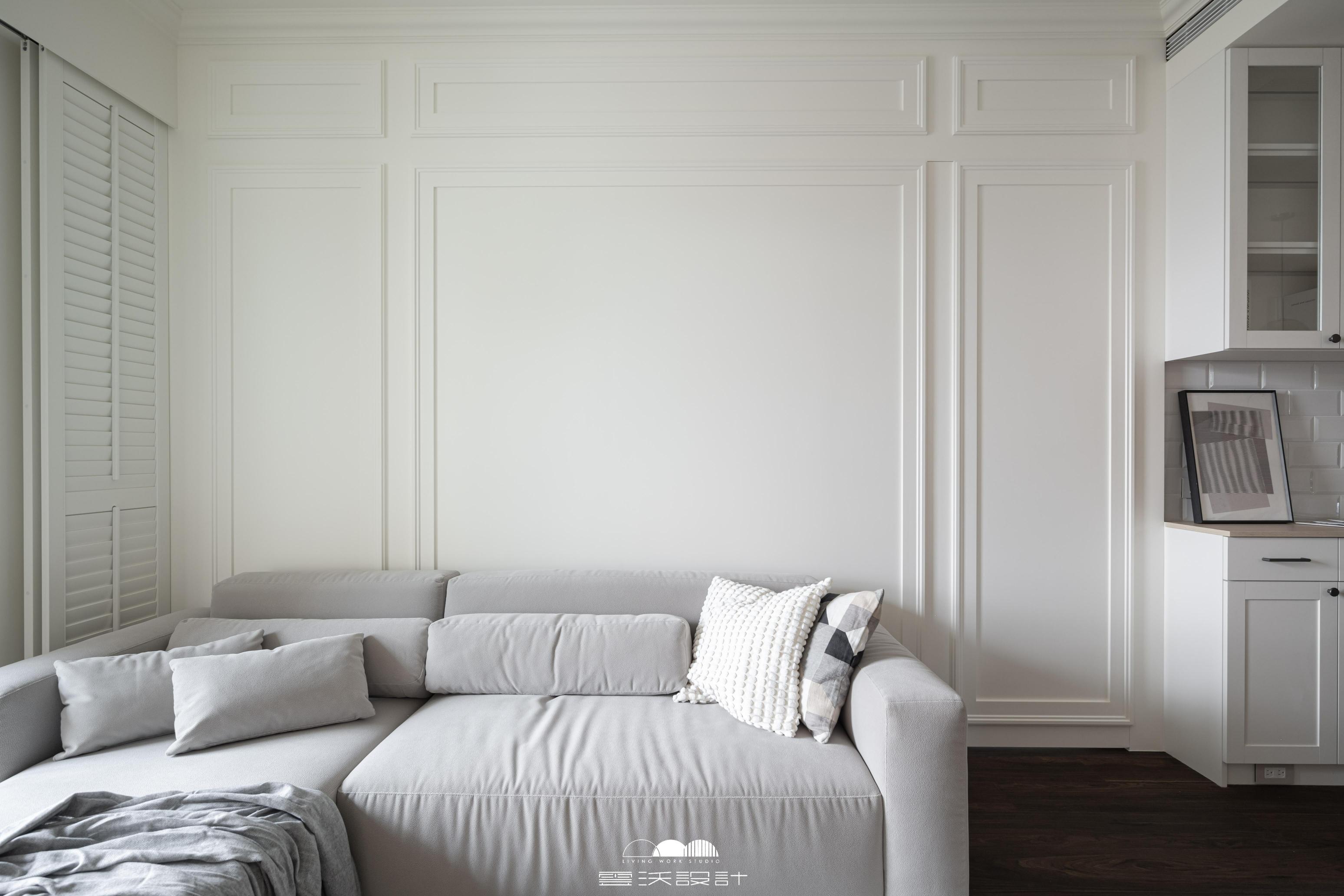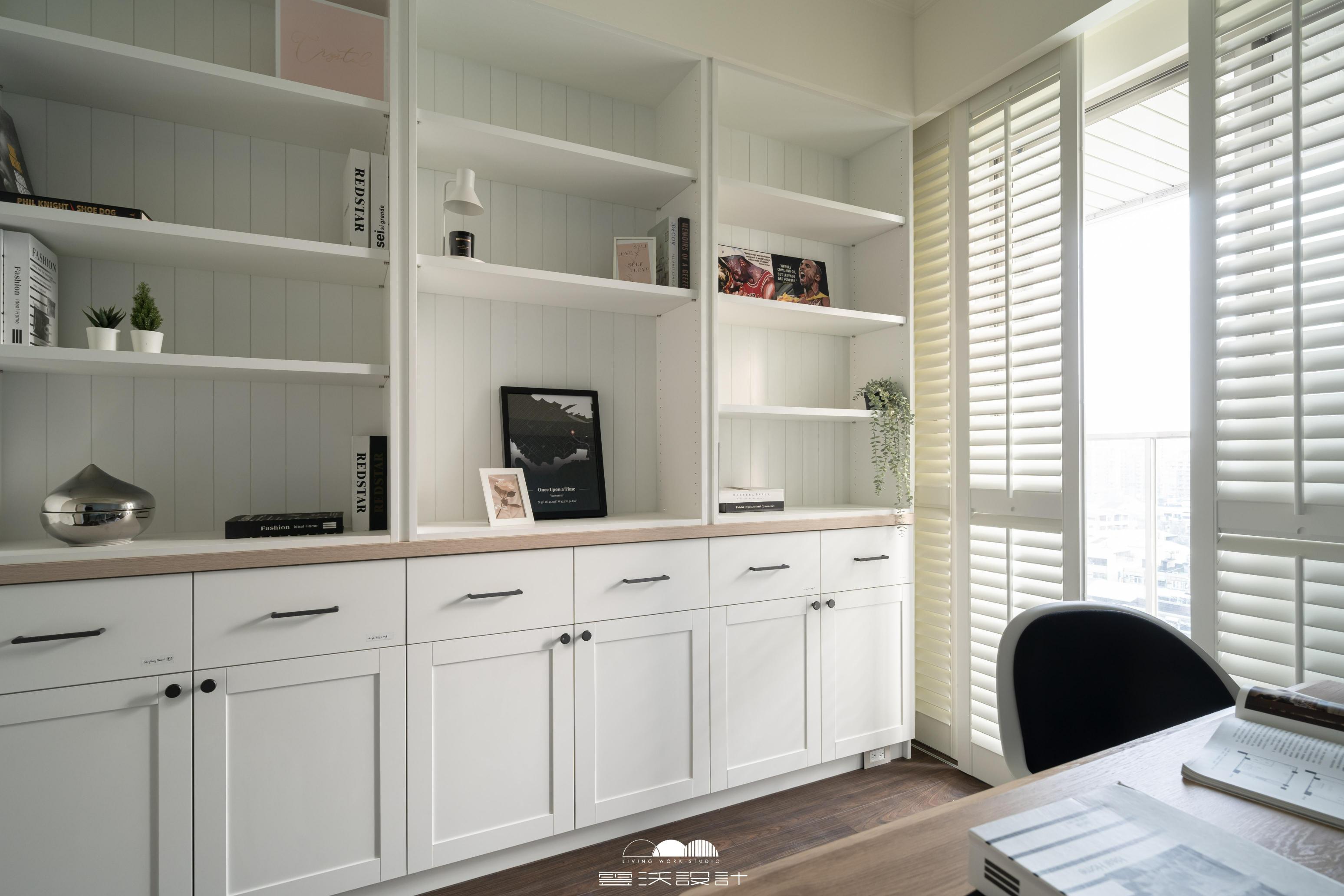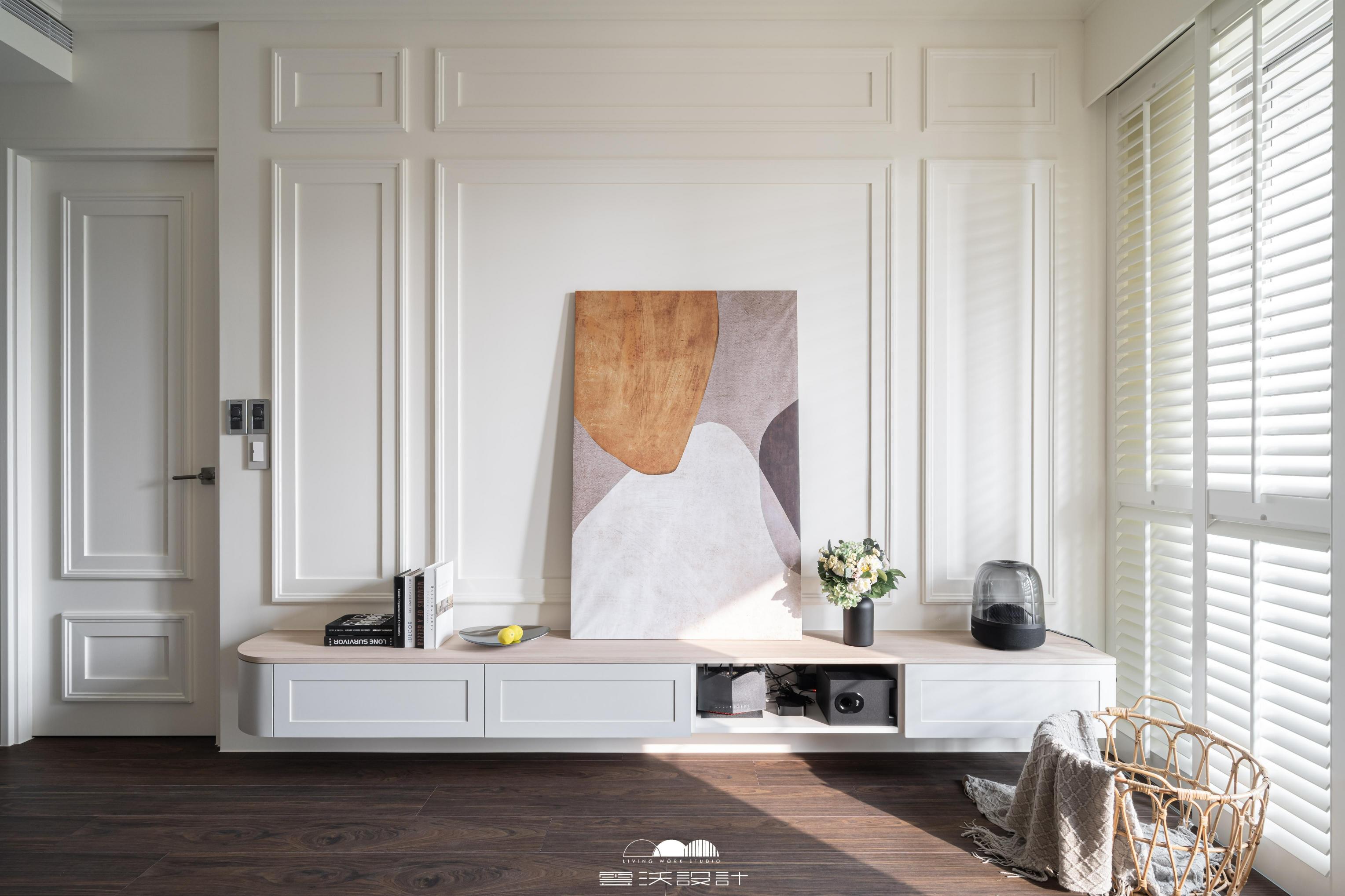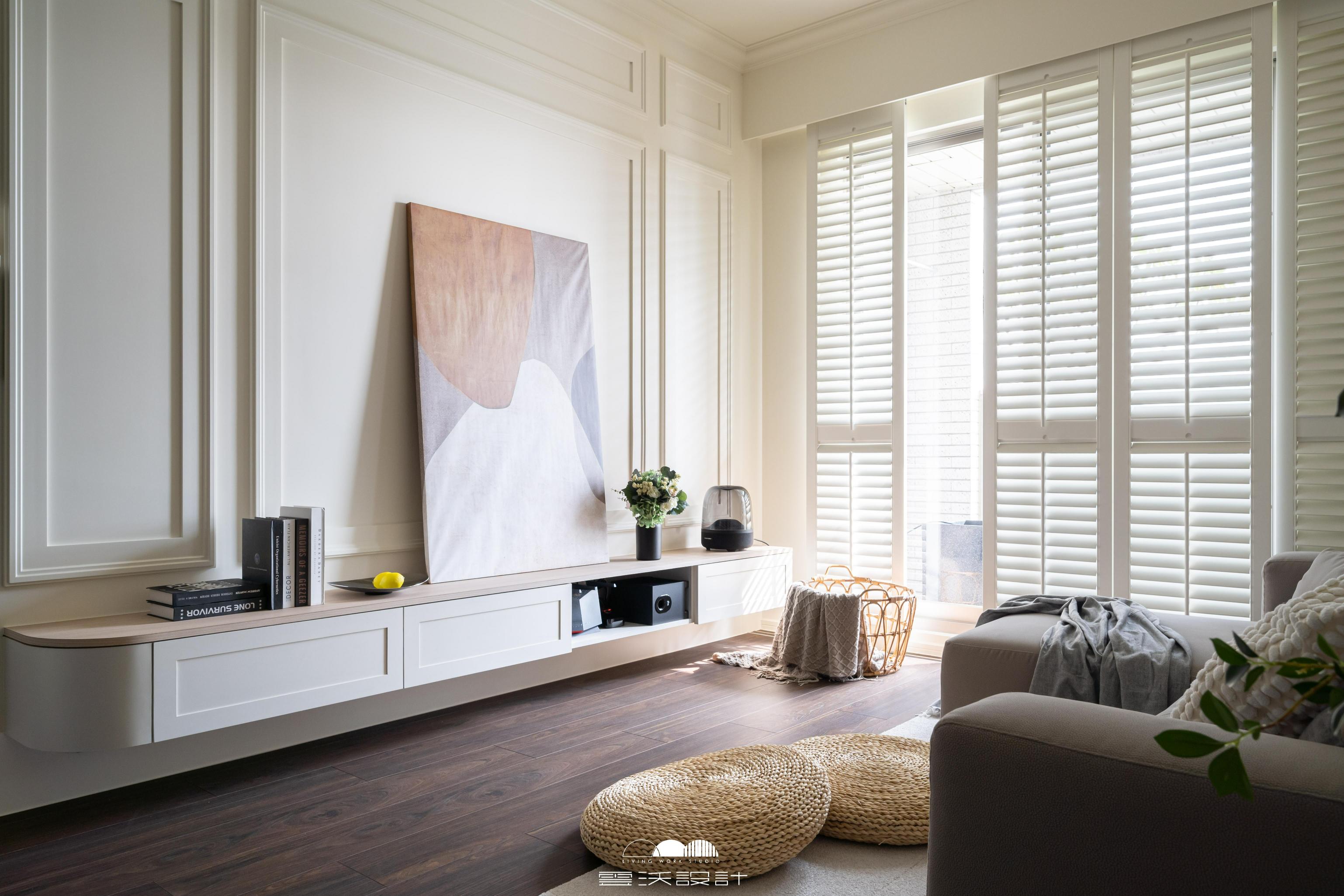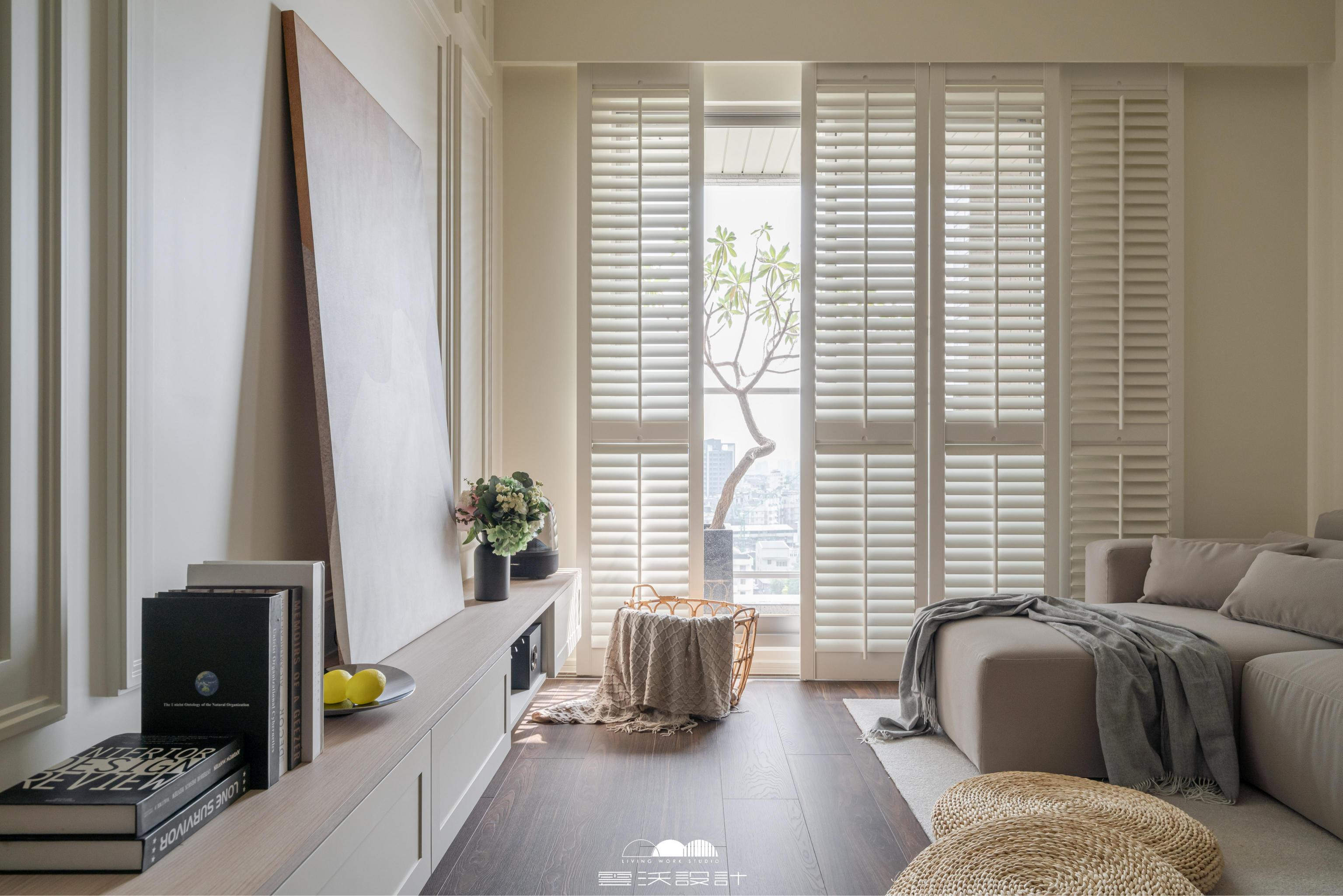 客廳則是另一個亮點,櫃體上使用了精緻的裝飾線板,增添了優雅感,展現出精緻的工藝水準。搭配上優雅的木百葉窗,不僅能有效調節光線,還是美式風格的經典象徵。整體色調柔和,米色、淺灰與木紋的搭配使空間明亮而優雅。營造出放鬆與平靜的氛圍,無論是享受家庭時光還是靜靜閱讀,讓您在忙碌的生活中獲得片刻的寧靜。