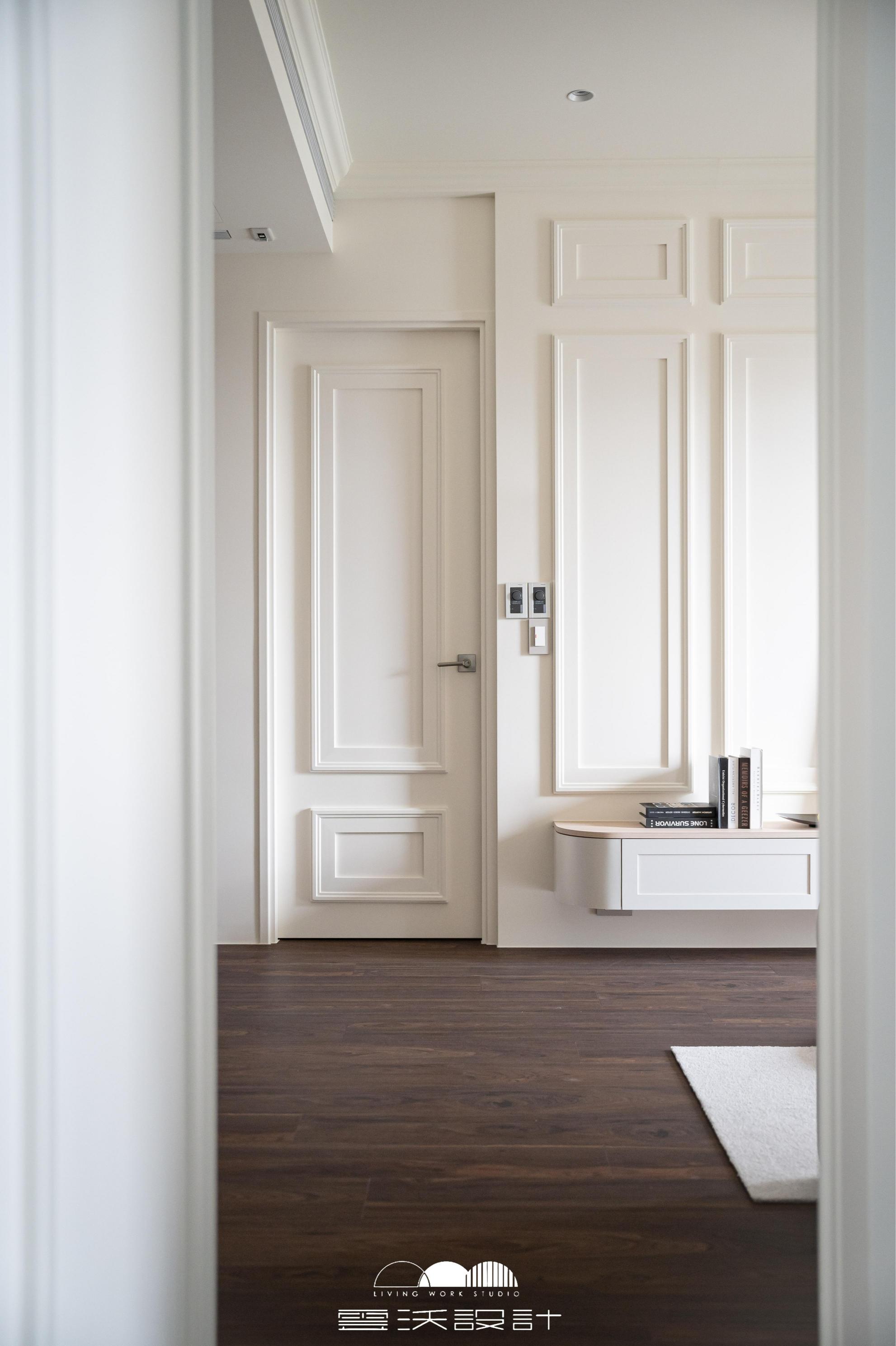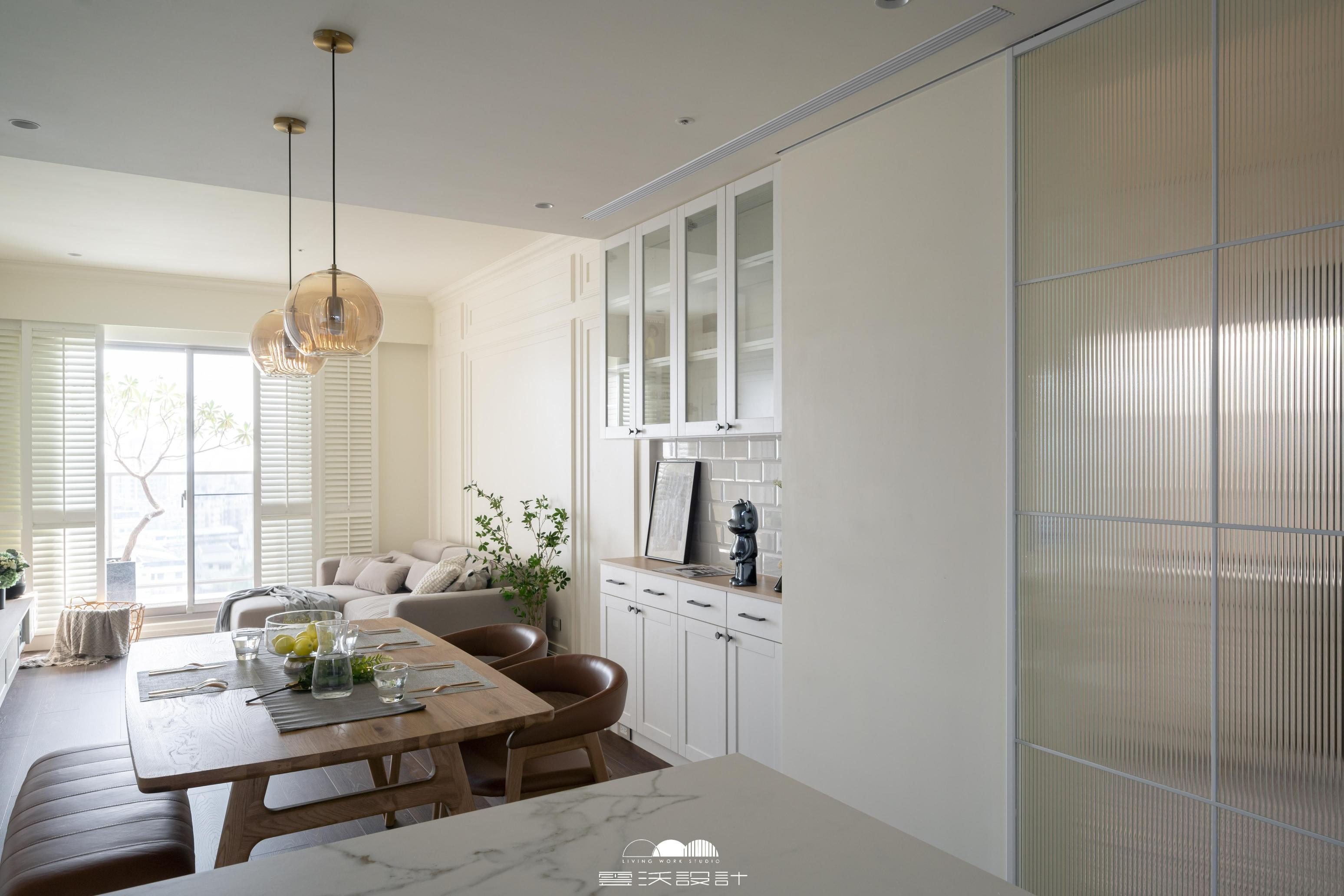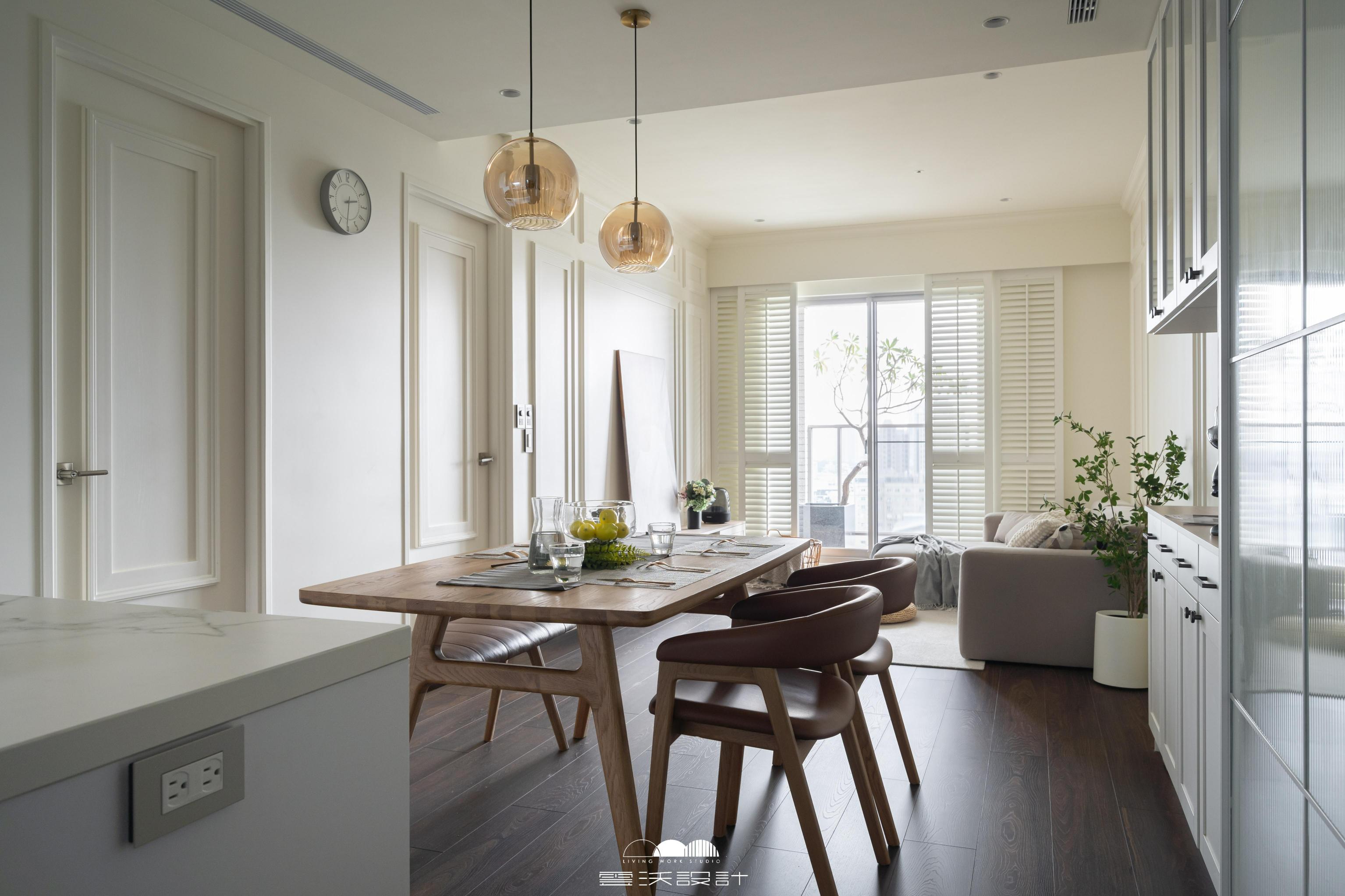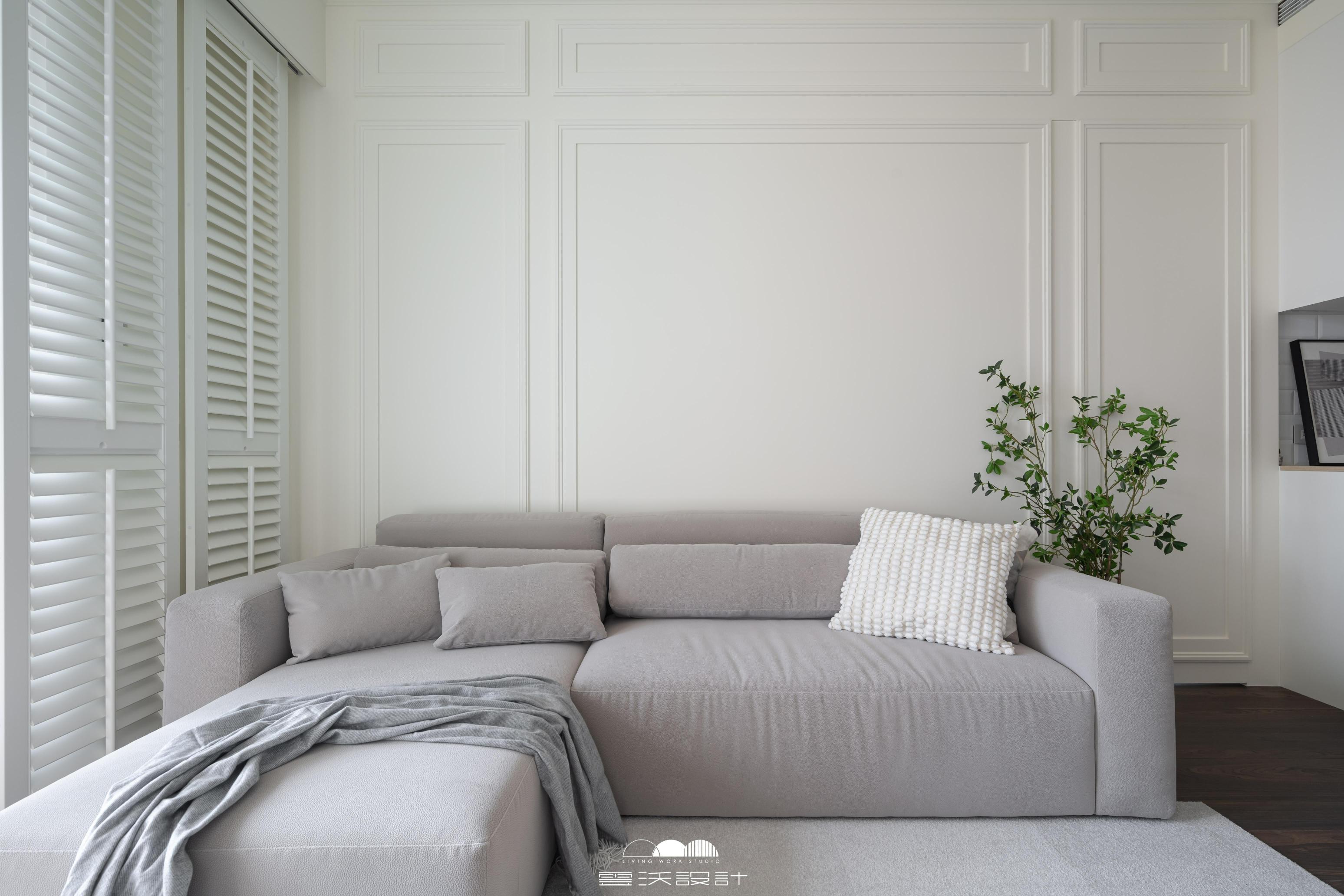 客廳則是另一個亮點,櫃體上使用了精緻的裝飾線板,增添了優雅感,展現出精緻的工藝水準。搭配上優雅的木百葉窗,不僅能有效調節光線,還是美式風格的經典象徵。整體色調柔和,米色、淺灰與木紋的搭配使空間明亮而優雅。營造出放鬆與平靜的氛圍,無論是享受家庭時光還是靜靜閱讀,讓您在忙碌的生活中獲得片刻的寧靜。