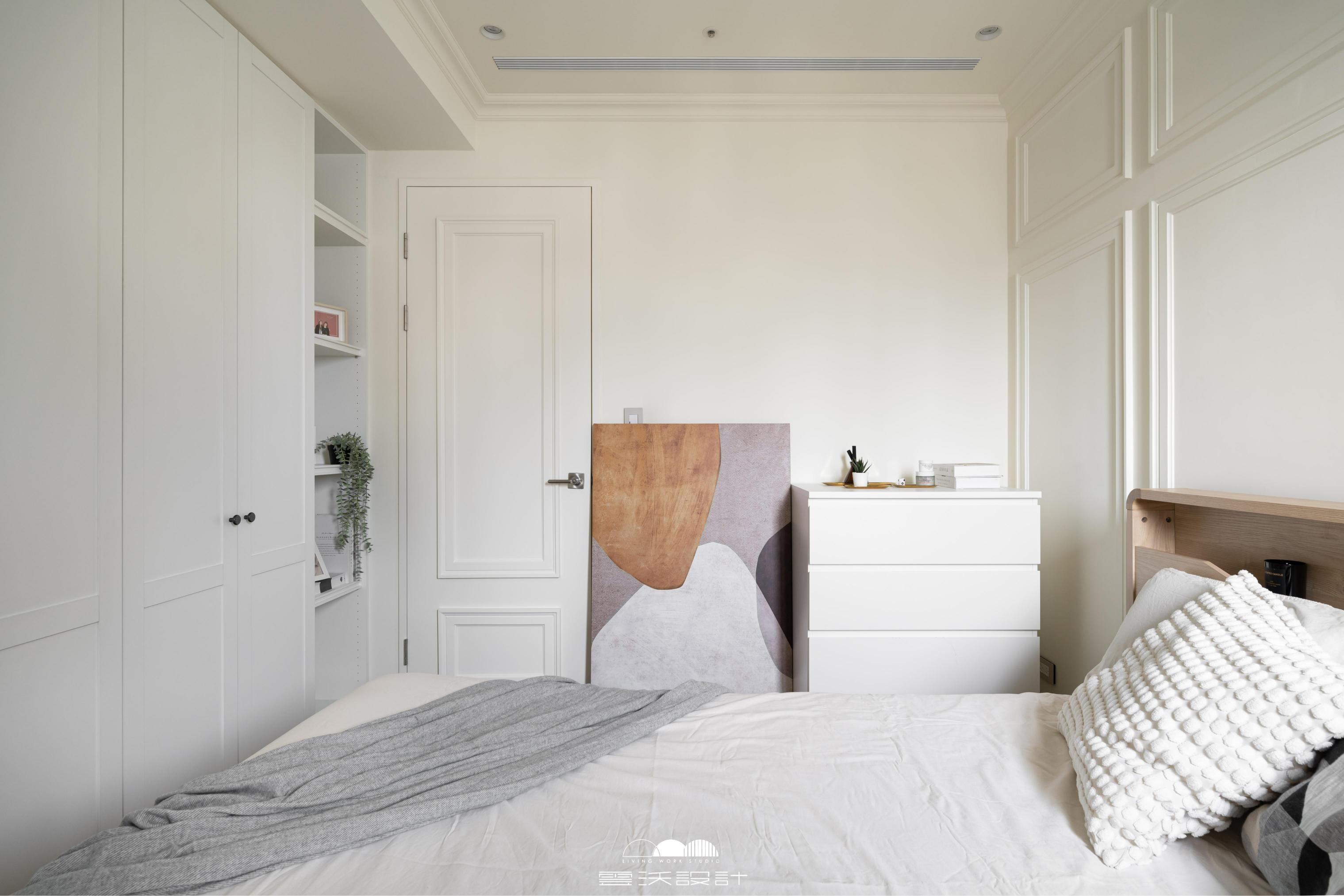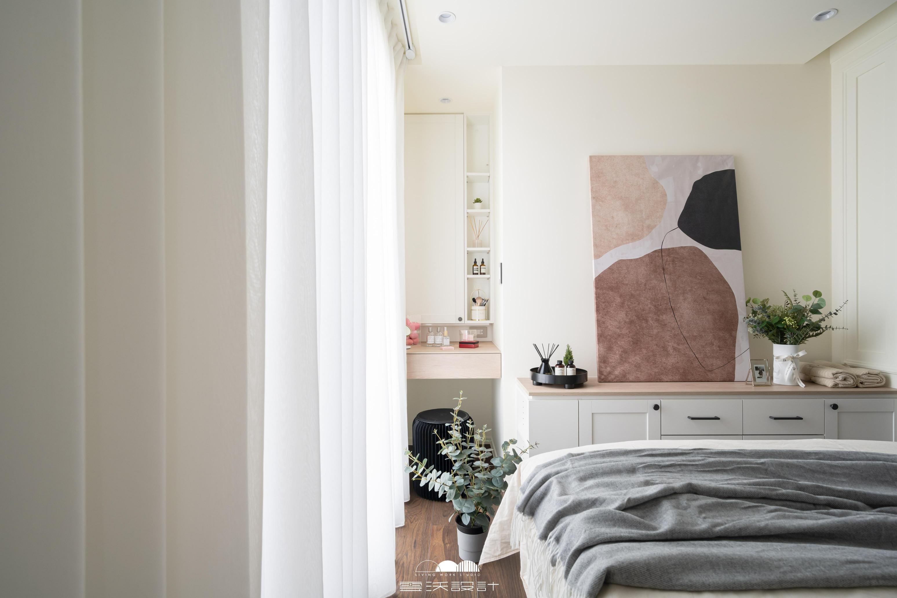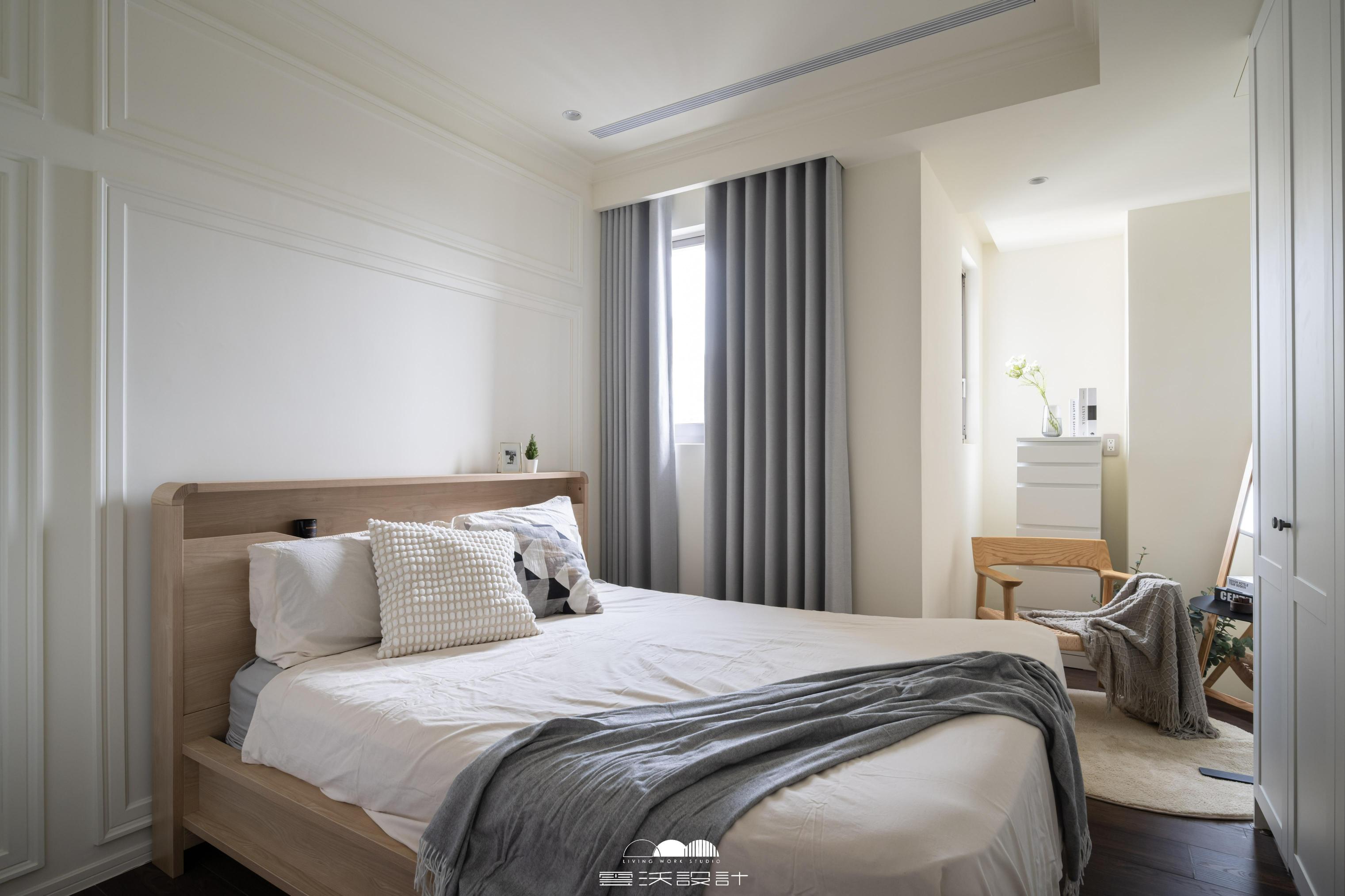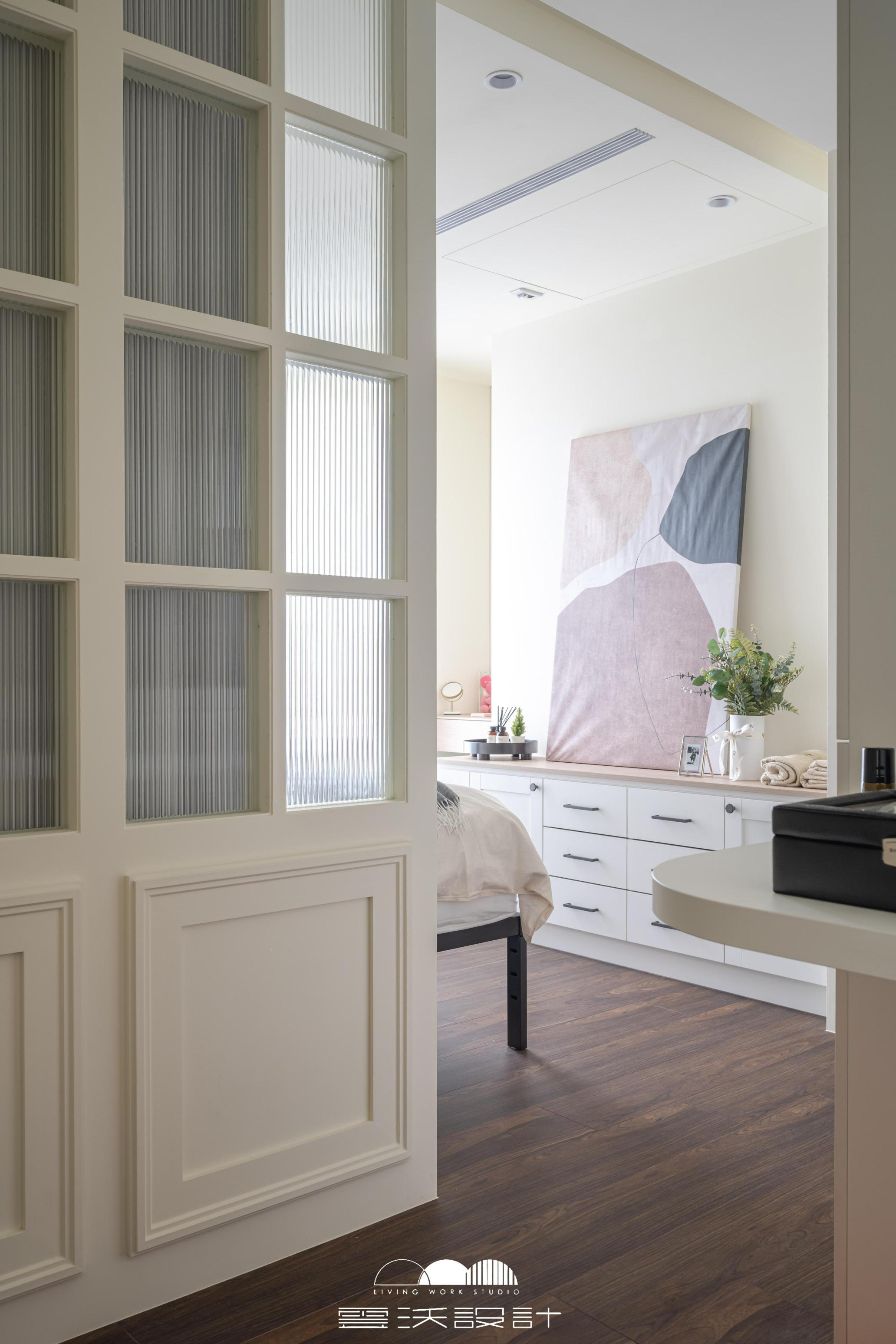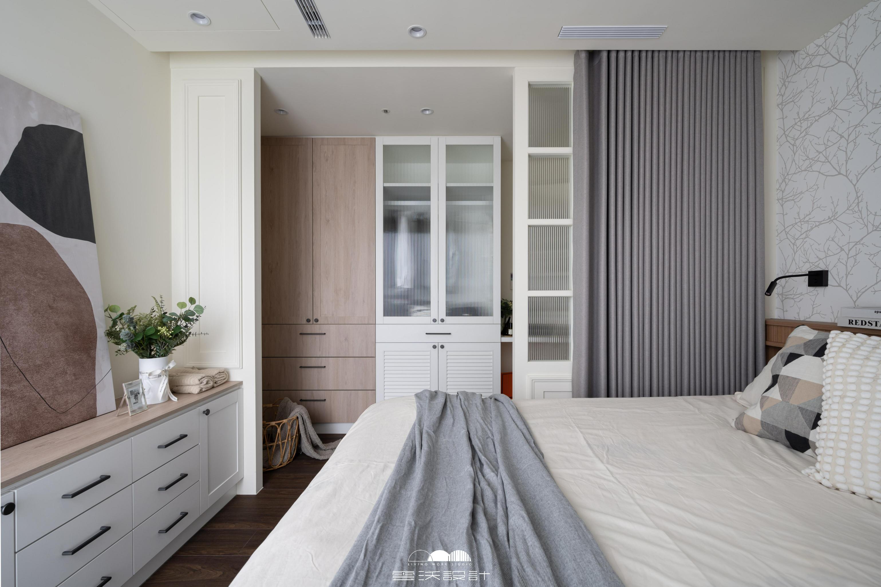 客廳則是另一個亮點,櫃體上使用了精緻的裝飾線板,增添了優雅感,展現出精緻的工藝水準。搭配上優雅的木百葉窗,不僅能有效調節光線,還是美式風格的經典象徵。整體色調柔和,米色、淺灰與木紋的搭配使空間明亮而優雅。營造出放鬆與平靜的氛圍,無論是享受家庭時光還是靜靜閱讀,讓您在忙碌的生活中獲得片刻的寧靜。
