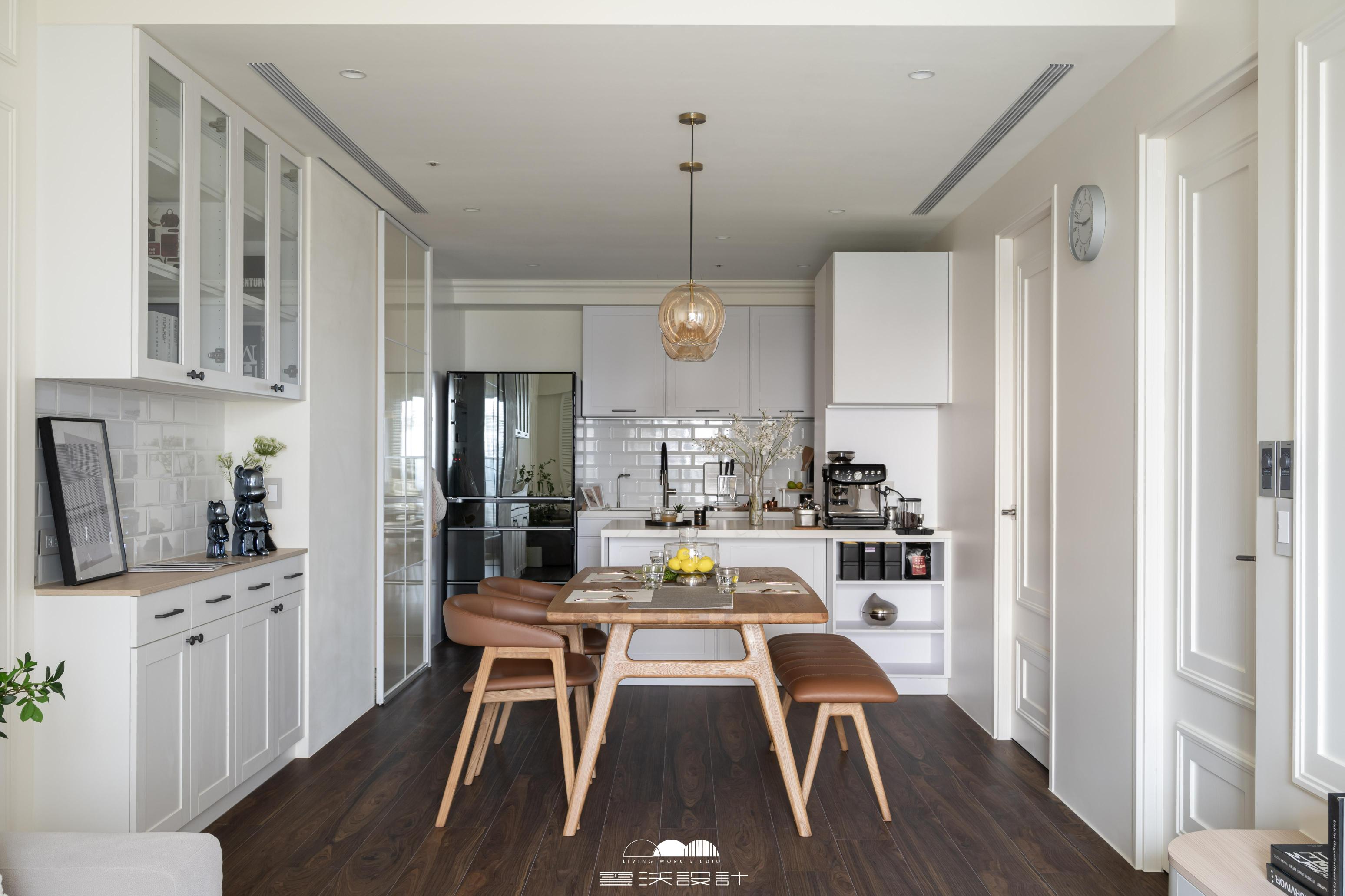三房美式輕奢住宅,廚房與客廳採用開放式的設計,瞬間營造出寬敞的視覺效果,同時使得烹飪和社交更為融洽,讓您在忙碌的廚房裡也能隨時與家人和朋友互動,為每個角落帶來溫馨的氛圍。