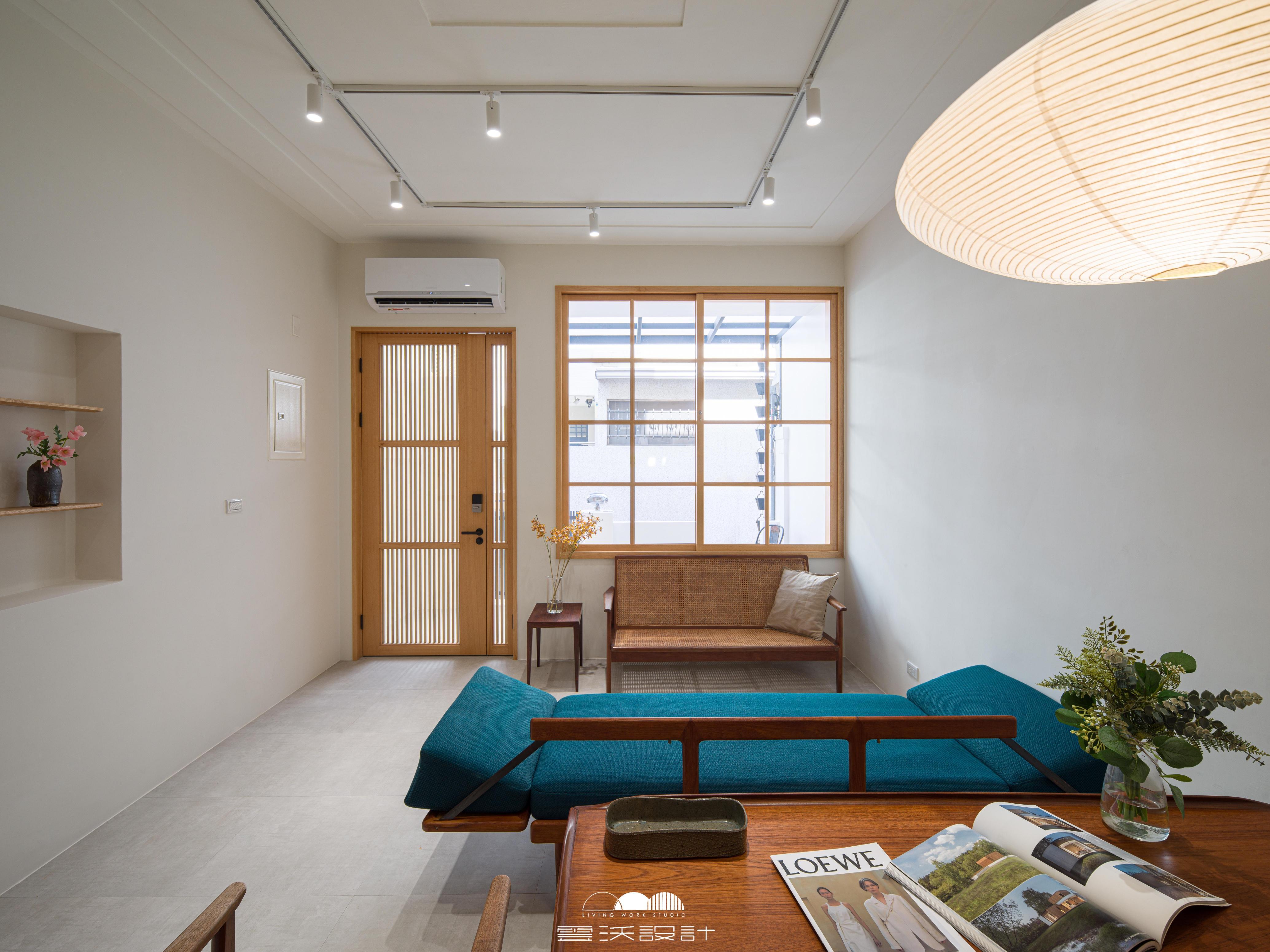 整體設計以日式簡約風格為核心概念,運用溫潤木質、低彩度牆面與留白比例,建立安定且耐看的空間基調。格柵與編織元素被運用於門片與窗景之中,在保有隱私的同時引入自然光線,改善老屋常見的昏暗問題,使室內外形成柔和而有層次的過渡。