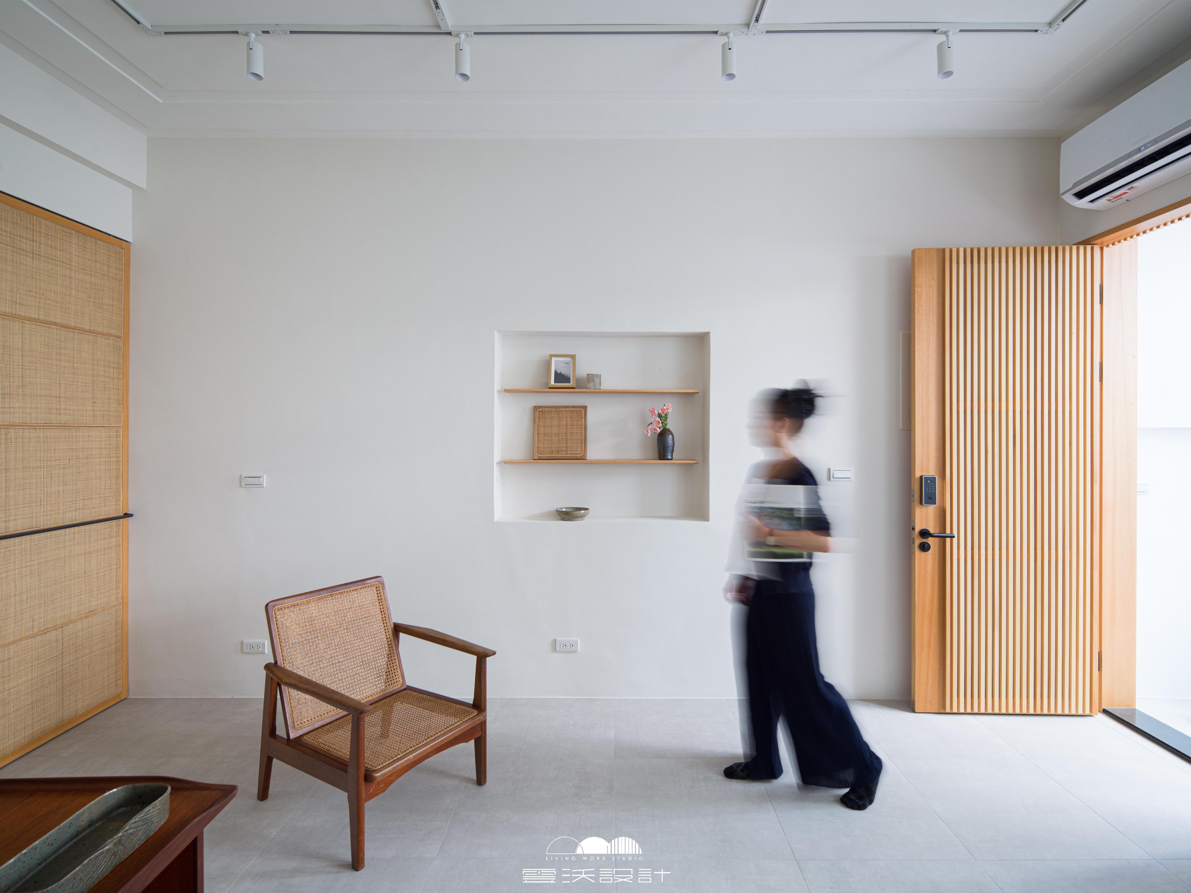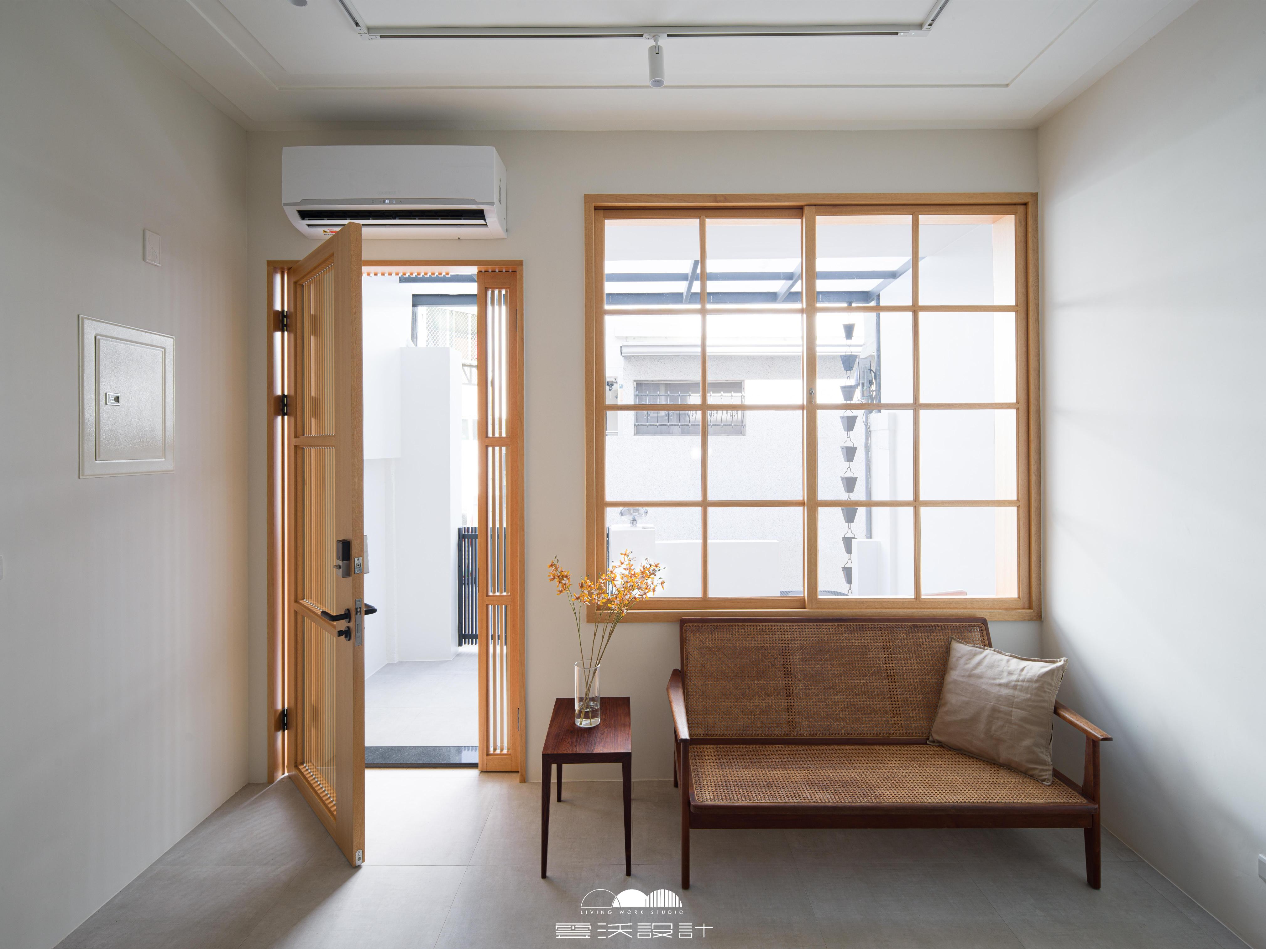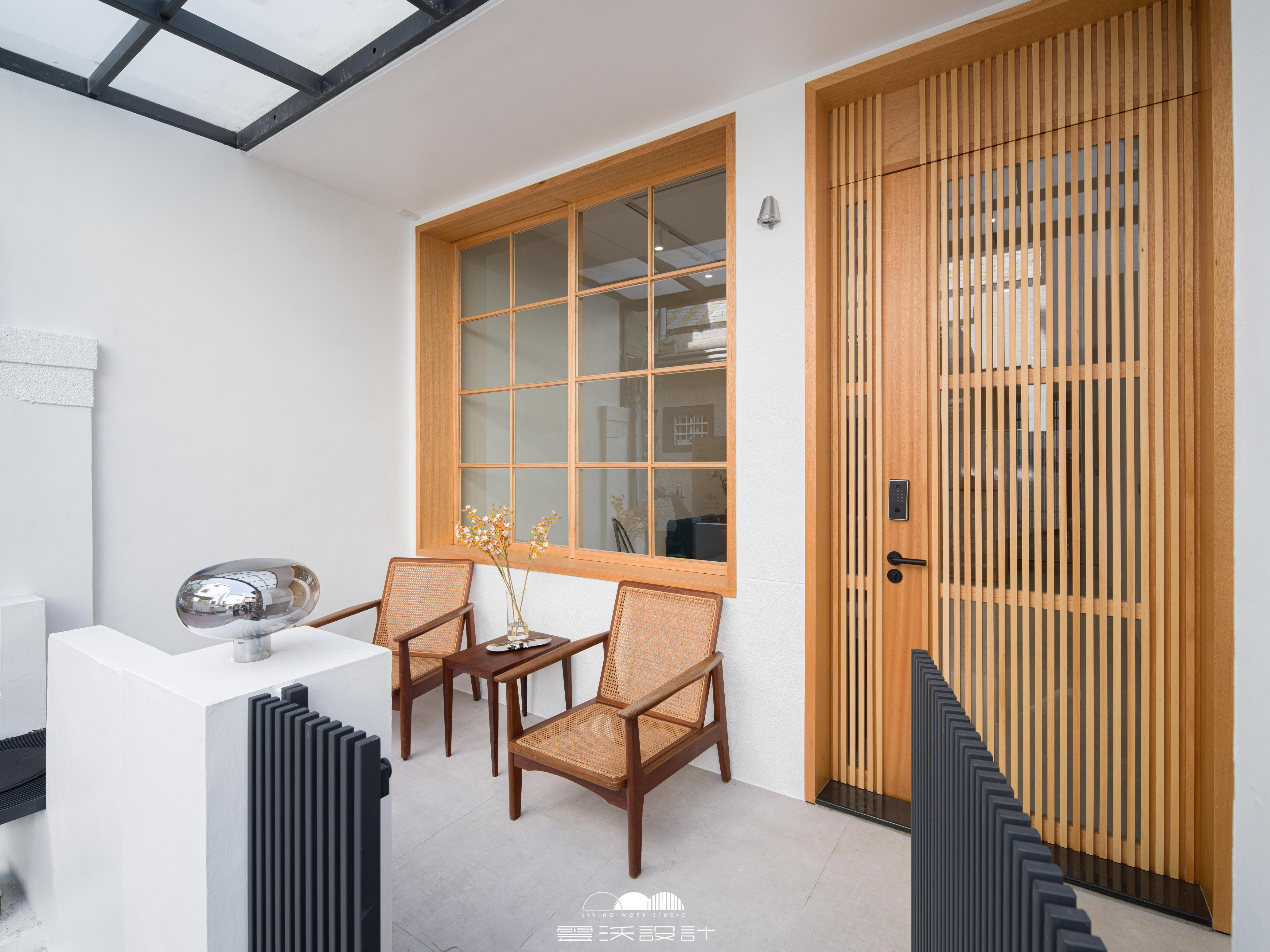 整體設計以日式簡約風格為核心概念,運用溫潤木質、低彩度牆面與留白比例,建立安定且耐看的空間基調。格柵與編織元素被運用於門片與窗景之中,在保有隱私的同時引入自然光線,改善老屋常見的昏暗問題,使室內外形成柔和而有層次的過渡。